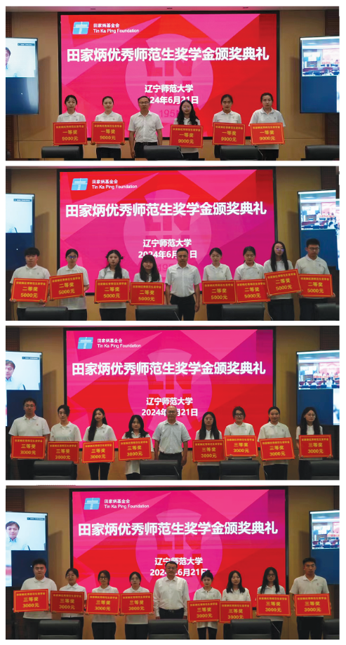 会上,党委常委、统战部部长兼学生处处长崔宝华宣读表彰通报;与会领导为获奖学生颁奖;原生命科学学院本科生、田家炳优秀师范生奖学金一等奖获得者、现大连市甘井子区第76中学教师张莹通过视频短片鼓励获奖学弟学妹携手并肩,共同在三尺讲台上书写青春华章;获奖学生代表进行交流发言,表达对母校培养的感激、对田家炳基金会捐资设奖的感恩和赞扬。颁奖典礼结束后,获奖学生在图书馆广场录制“讲台,我们来了!”快闪视频短片,表达对教师职业的热爱和投身教育事业的决心。