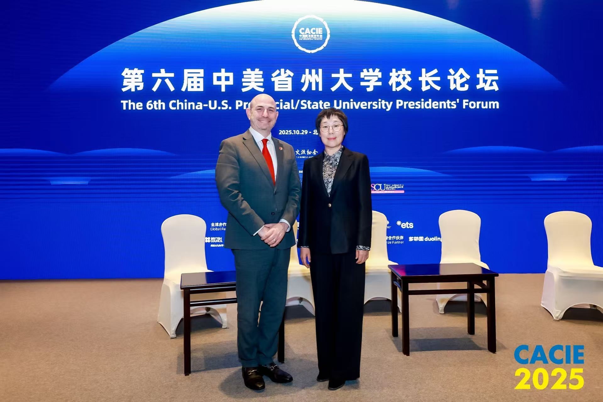 我校党委书记刘宏应邀担任第六届中美省州大学校长论坛的主旨发言嘉宾。她在主旨发言中回顾了我校自2000年与美国密苏里州立大学签署教育合作意向书以来,开启中美教育合作的25年历程。刘宏指出,我校是中美合作历程的见证者,积极的参与者,坚定不移的贡献者。25年间,我校与密苏里州立大学的中外合作办学机构历经中国教育部、AACSB、HLC等国内外权威认证,保持着高质量、高标准;办学优选高水平、教学经验丰富的教师,构建高素质、稳定的核心师资队伍。与美国哈佛大学共同举办的“东北文学与文化”学术研讨会,首次提出“东北学”概念成为业界标杆;2025年,响应习近平主席的号召,邀请美国青少年来校开展YES项目,沉浸感知中国文化。与密苏里州立大学的合作深入到学术、科研、人才培养等各个领域,构建起全方位、多层次、宽领域的教育交流合作平台。中美间的往来交流,为双方的合作注入源源不断的活力。