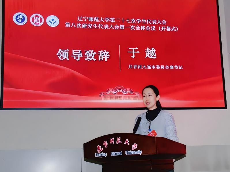 共青团大连市委员会副书记于越代表团市委、市学联,向大会顺利召开表示热烈祝贺,并向全校师生致以亲切问候。她充分肯定了我校学生会、研究生会过去一年在思想引领提升、组织建设提质、服务师生提效等方面的工作成绩,并对全体同学提出三点希望:一要坚定教育初心,将个人理想融入教育强国与辽宁振兴大局;二要锤炼师范本领,扎实专业基础,主动拥抱数智时代的教育变革;三要践行服务使命,学生会组织应想同学之所想,急同学之所急,做实做细服务保障。她诚挚邀请广大青年学子融入大连、留在大连,与城市同发展、共成长,并相信辽师团学组织能继续团结带领青年学子为大连振兴发展贡献青春力量。