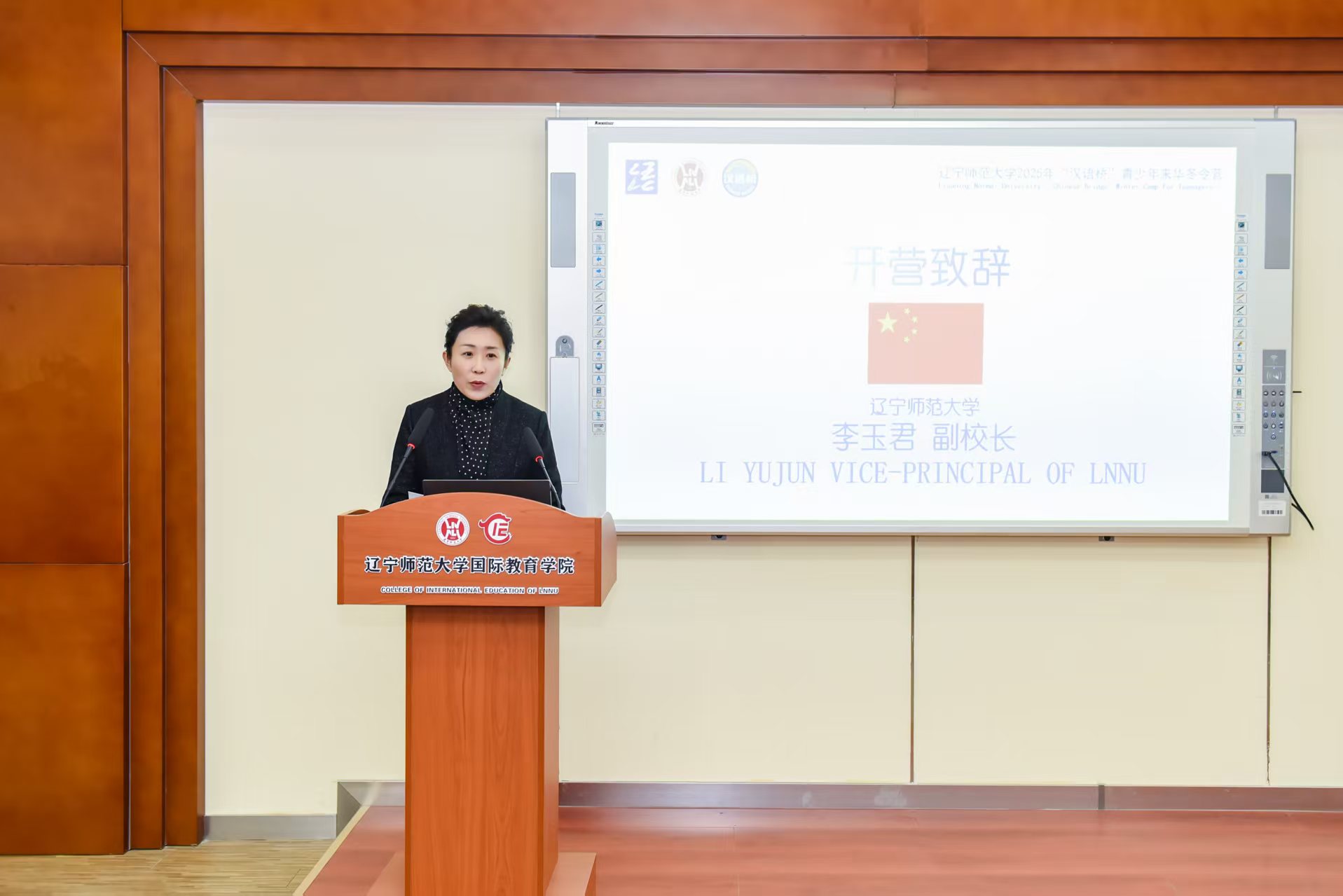 李玉君对参加本次冬令营的师生表示热烈欢迎,并向主办方教育部中外语言交流合作中心给予我校的信任与支持表达了诚挚谢意。李玉君表示,辽宁师范大学与瑞士伯尔尼华夏中文学校精诚合作,将网络中文课堂这一平台打造成为跨越山海的桥梁,不仅实现了优质教育资源的共享,更持续为中外人文交流注入新的活力,取得了令人瞩目的成果。本次冬令营将为大家提供一次“沉浸式”的体验机会,实现从“线上认知”到“线下感知”的跨越。李玉君希望学员们珍惜这次难得的机会,积极交流,用心体会,进一步增进对中国文化的理解和热爱。