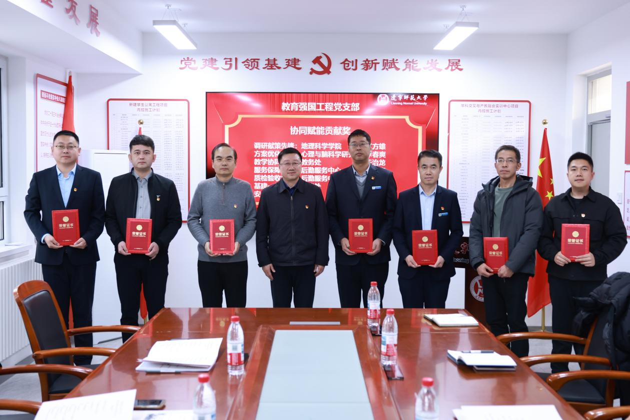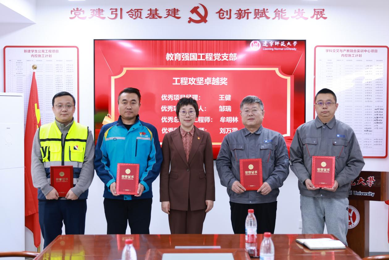 为树立榜样、激励先进,充分发挥先锋模范的示范引领作用,大会对在教育强国工程建设中表现突出的先进个人予以表彰。经支部慎重研究决定,授予王建、邹瑞、牟明林、刘万雷4名同志“工程攻坚卓越奖”,表彰他们在项目施工、质量监理等一线攻坚中展现的专业素养与责任担当;授予王方雄、李春爽、于治龙、张鼎寅、高海悦、刘刚、肖慧翔7名同志“协同赋能贡献奖”,致敬他们在校内跨部门协同、服务保障等工作中付出的辛勤努力与突出贡献。刘宏、曹锡顶分别为获奖者颁奖。