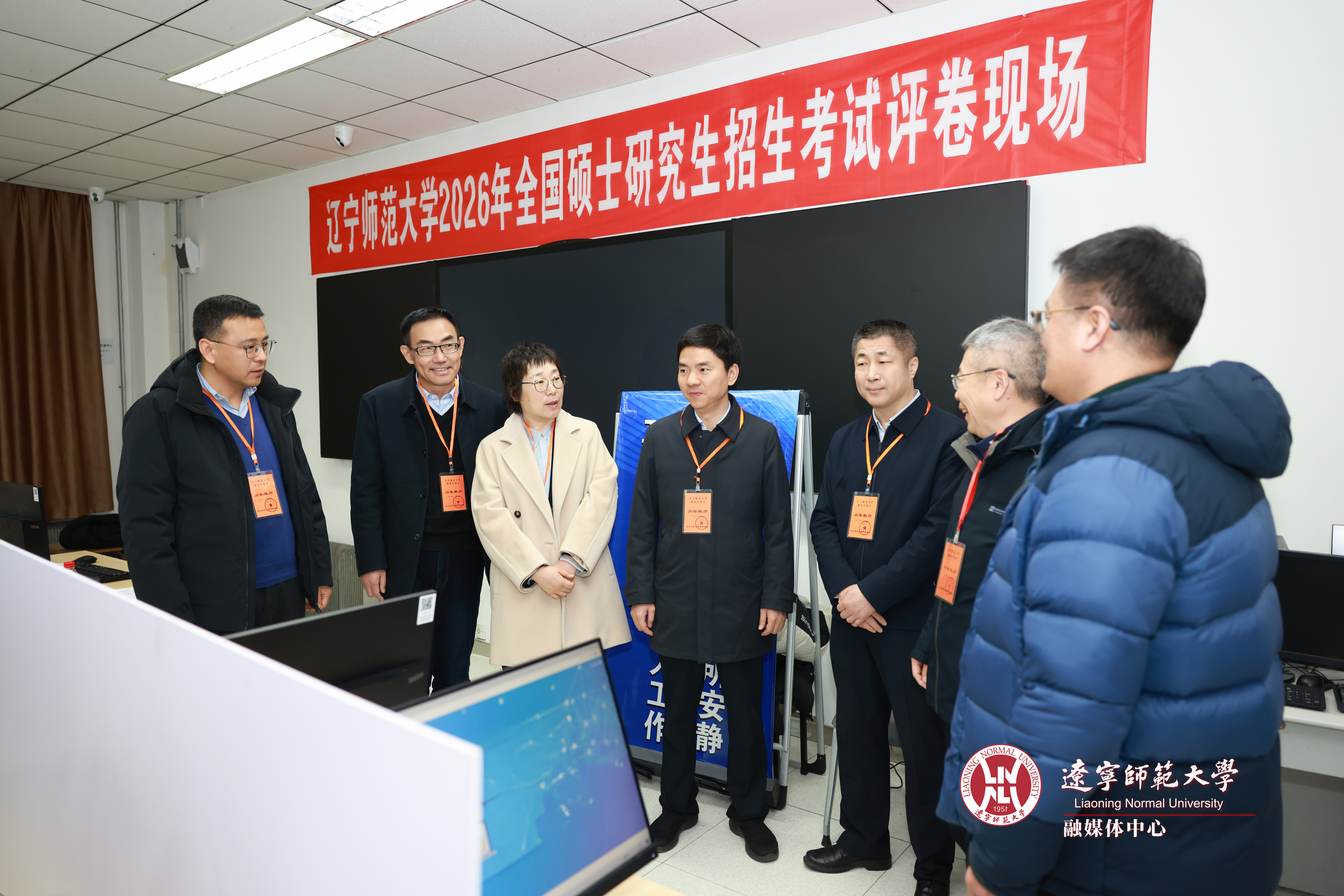 1月16日上午,校党委书记刘宏、校长罗文波,校领导于长河、刘魁勇、宫利东亲临评卷现场,检查指导我校2026年硕士研究生招生考试自命题科目网上评卷工作。