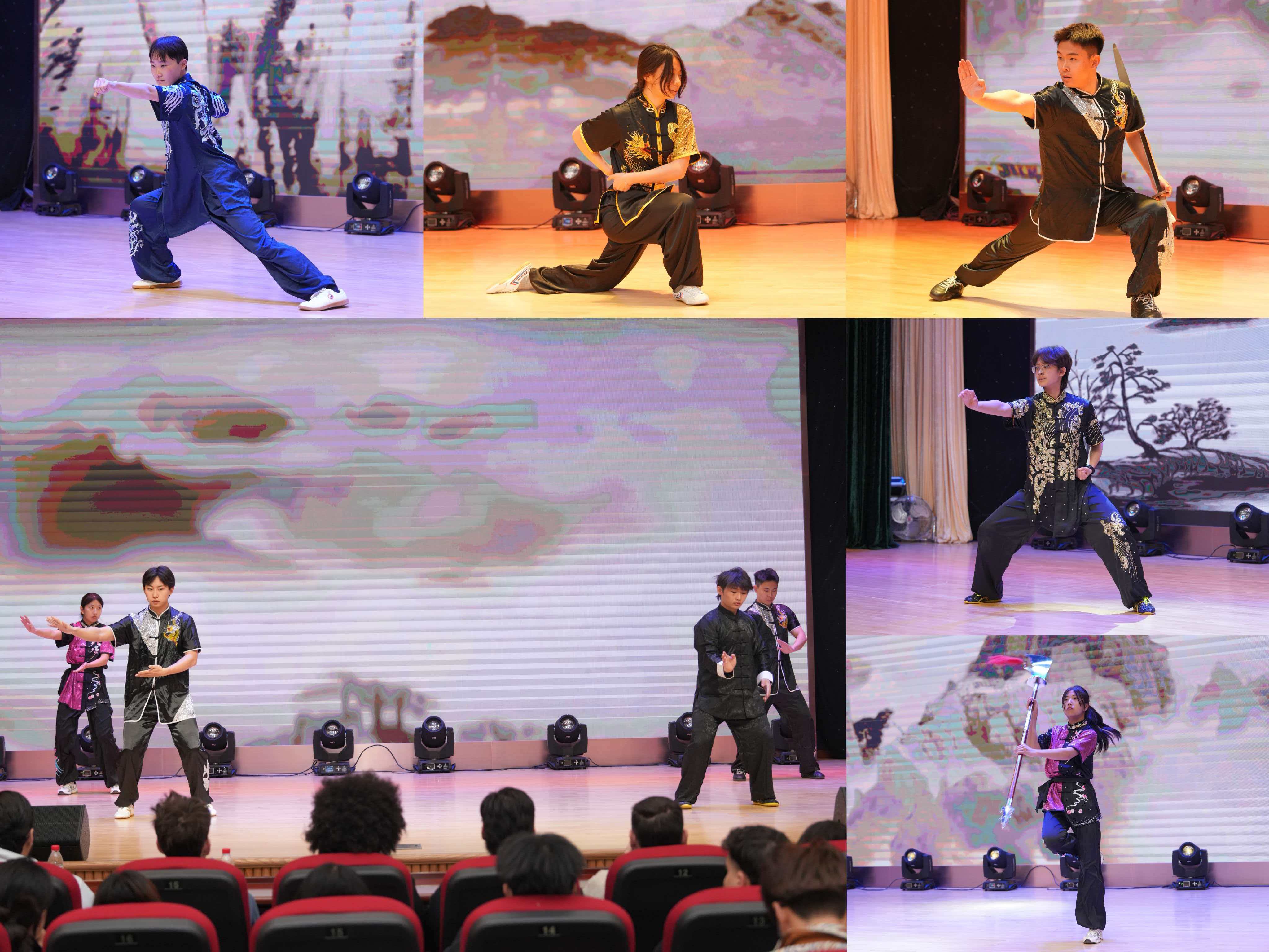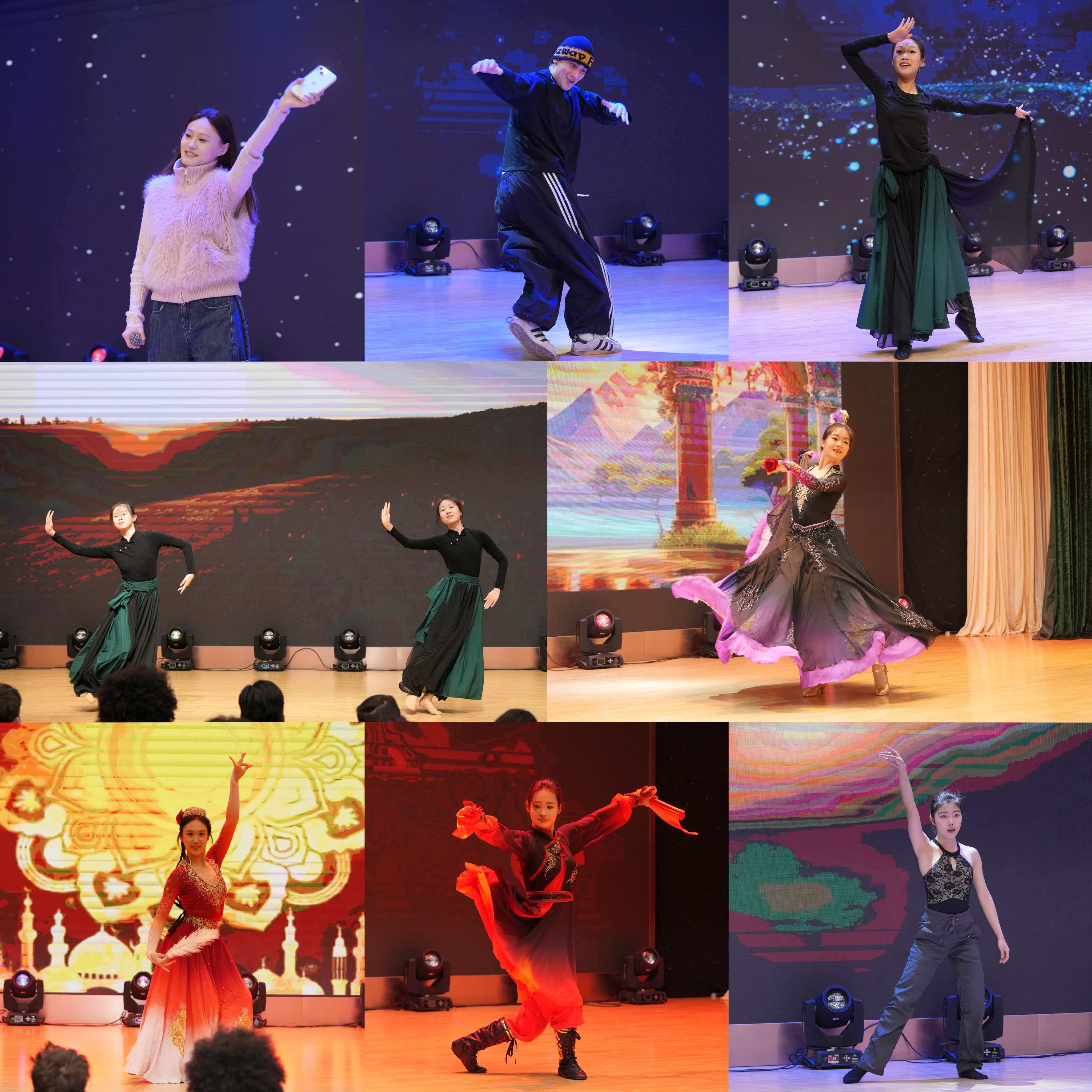 随后的才艺展示环节精彩纷呈:外国语学院雷震宇带来歌曲《夜空中最亮的星》,国际教育学院俄罗斯留学生郝靓仔表演街舞《夜如此寂静》,音乐学院肖迪菲等7人呈现民族舞蹈串烧,体育学院王璐等5人展示中华武术《风・林・火・山》。多样的文艺表演展现青春风采与中华文化魅力,赢得全场热烈掌声。