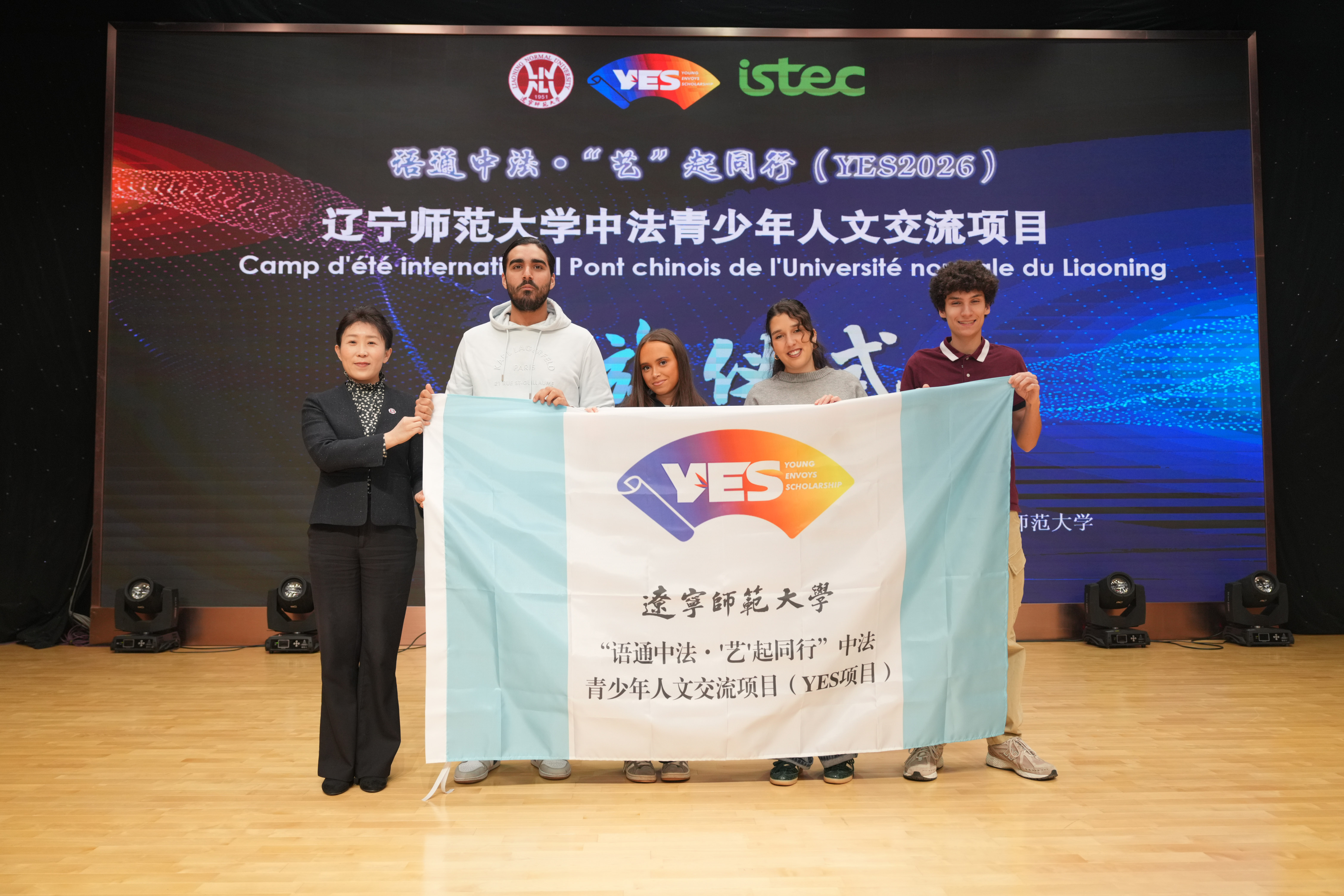 仪式现场举行庄重的授旗仪式,李玉君为YES项目授旗,法国学生代表Dalil、Soulaimane、Nina、Emeline上台接旗,象征项目正式启动。
