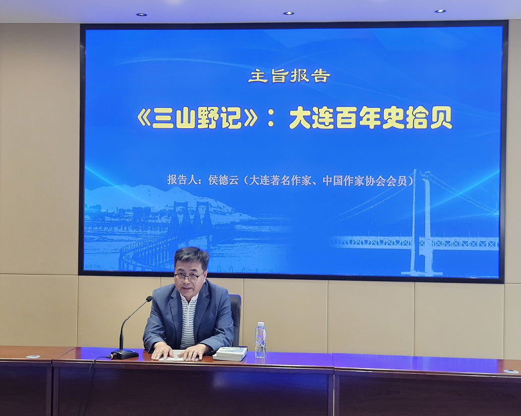 侯德云先生随后作主旨报告《〈三山野记〉:大连百年史拾贝》。他梳理了笔记小说从魏晋志人到明清小品再到当代创作的源流演变,指出《三山野记》承袭这一文体传统,以碎片拼图方式还原城市记忆。报告以青泥洼刻有“1899”的瓷碗、同一站台叠加的俄国铁轨与日本邮戳、劳动公园铜钟上的裂痕、穿行百年的有轨电车铃声等在地细节,以及城市四度更名的血泪转音、码头工号里凝固成盐的咸味等意象,将抽象历史化为可触可感的体温。报告还涉及傅立鱼、张本政等代表性人物和大连话、海港号子、老厂房等地域文化元素,让一座城市的屈辱、抗争与重生跃然眼前。整场报告学术扎实、情感饱满,引发在场师生强烈共鸣。