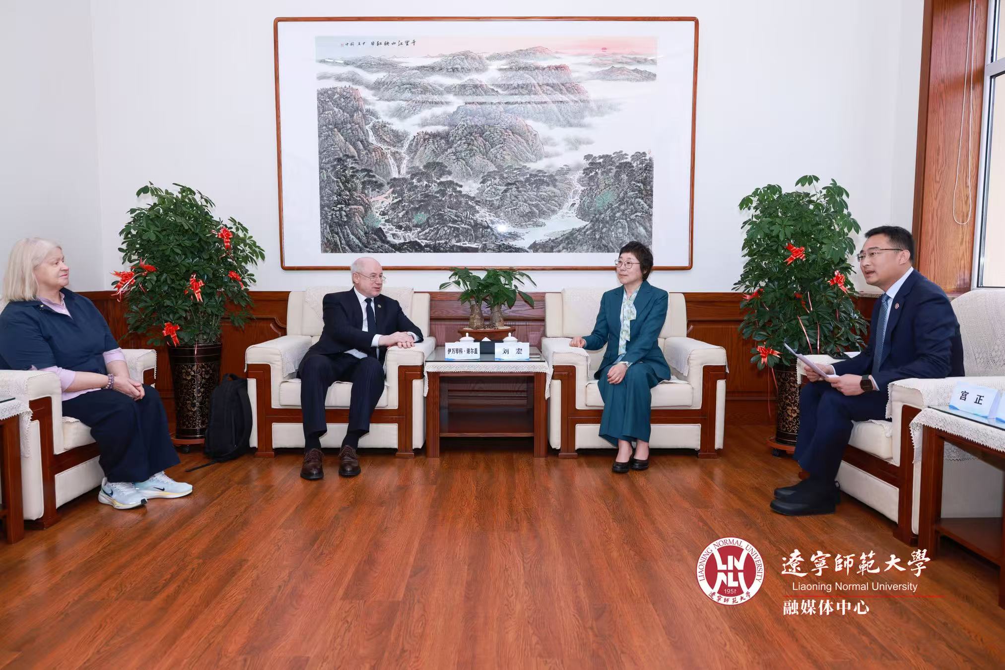 刘宏对伊万琴科一行的来访表示热烈欢迎,感谢伊万琴科在担任俄罗斯太平洋国立大学校长期间对中俄教育人文交流做出的杰出贡献,向代表团介绍了我校作为师范大学的学科优势及对俄国际交流方面取得的成果,并回顾了两校去年合作举办俄语教学学术研讨取得的丰硕成果。她介绍,去年我校与俄罗斯教育科学院及莫斯科大学教育系紧密合作,举办了俄罗斯教育科学院士工作坊。她表示,深圳北理莫斯科大学是中俄两国人文交流机制框架下取得的最重要成果,希望两校发挥学科专业优势,在2026-2027中俄教育年背景下携手合作,在人工智能时代高水平俄语人才培养、俄语语言与文化研究、区域国别研究、师资队伍建设等多领域展开交流与合作。她还向伊万琴科介绍了辽宁师范大学的“一体两翼”发展战略,指出国际化发展是学校今后一段时间的努力方向,学校目前也积极探讨在境外办学,希望多学习深圳北理莫斯科大学作为中俄合作举办大学的宝贵管理经验。