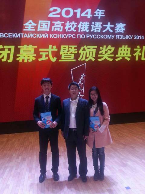 在11月21-23日举行的2014年全国高校俄语大赛中我院俄语系2011级杨美旋同学喜获高年级组单项演讲比赛一等奖(第一名),2013级唐兴翰同学获低年级组单项演讲比赛二等奖(第四名),吴安娜和刘一潮分别获得研究生组和低年级组大赛优秀奖。