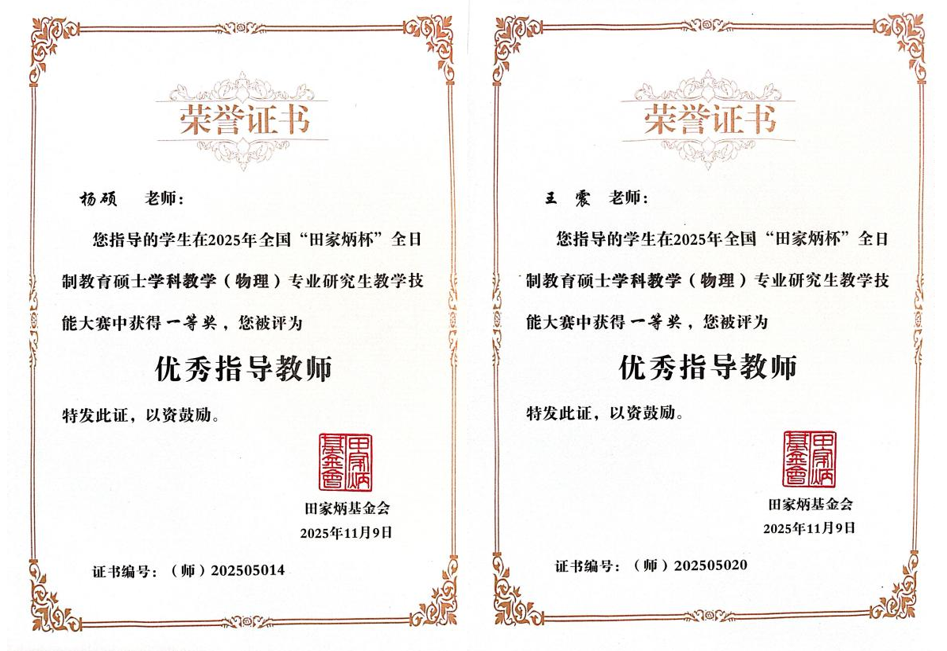近日,2025年全国“田家炳杯”学科教学(物理)专业研究生教学技能大赛决赛在华南师范大学圆满落幕,物理与电子技术学院2024级学科教学(物理)专业研究生郑佳慧、王荔双双荣获国家级一等奖,王震、杨硕两名教师获评“优秀指导教师”。