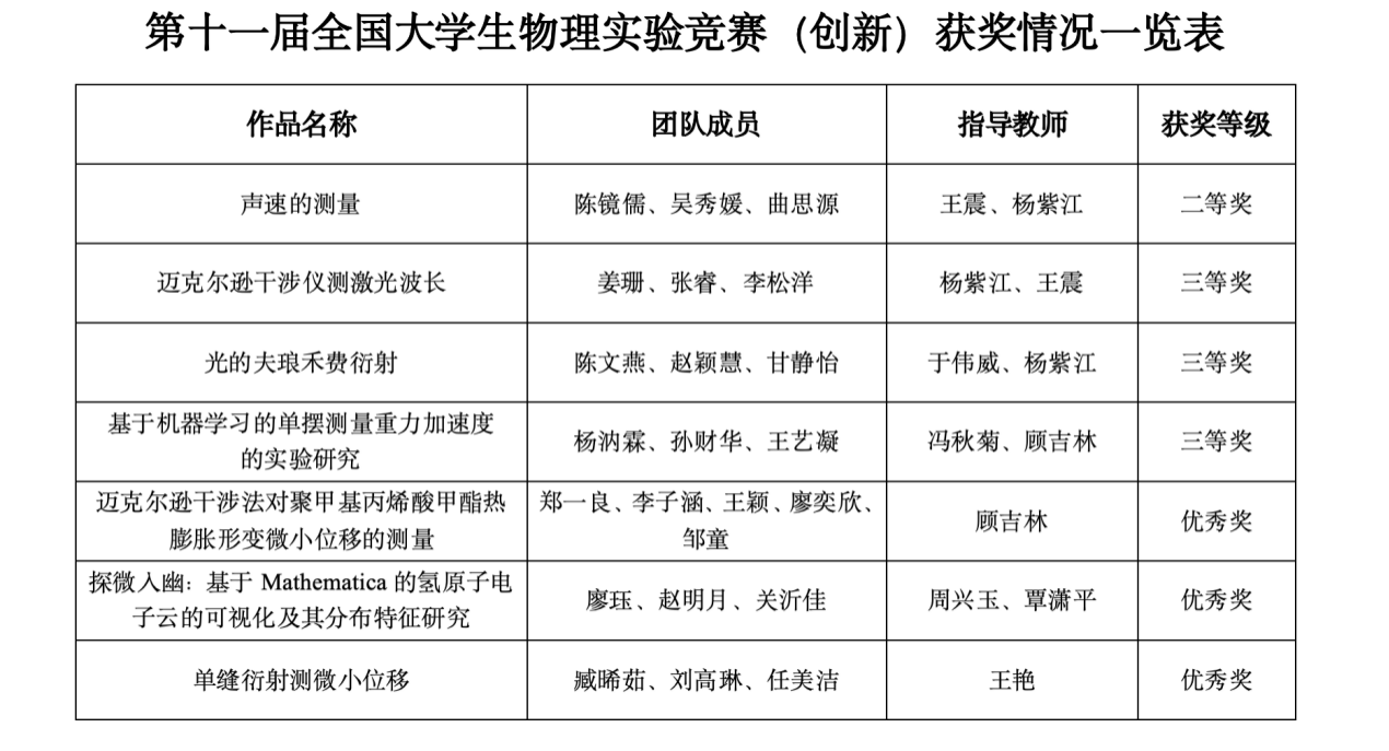 物理与电子技术学院领导高度重视此项比赛,自年初组委会发布竞赛通知后,立即针对相关年级本科生开展宣讲动员,为参赛学生选配指导教师,督促和指导师生研究参赛方案,打磨竞赛作品,力求尽善尽美。9月,我校参赛队伍经辽宁省普通高等学校本科大学生物理竞赛选拔确定参加国赛。在最终全国722所高校3260支参赛队伍的激烈角逐中,我校推选的讲课类作品“声速的测量”荣获国家级二等奖,讲课类作品“迈克尔逊干涉仪测激光波长”、命题类作品“光的夫琅禾费衍射”和“基于机器学习的单摆测量重力加速度的实验研究”荣获国家级三等奖,自选类作品“探微入幽:基于Mathematica的氢原子电子云的可视化及其分布特征研究”、命题类作品“单缝衍射测微小位移”和“迈克尔逊干涉法对聚甲基丙烯酸甲酯热膨胀形变微小位移的测量”荣获国家级优秀奖。