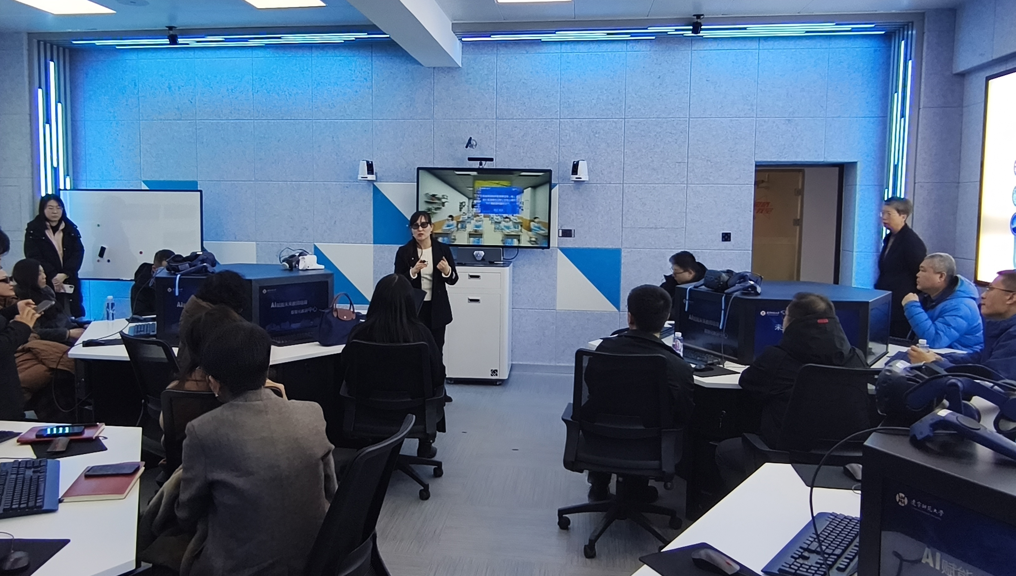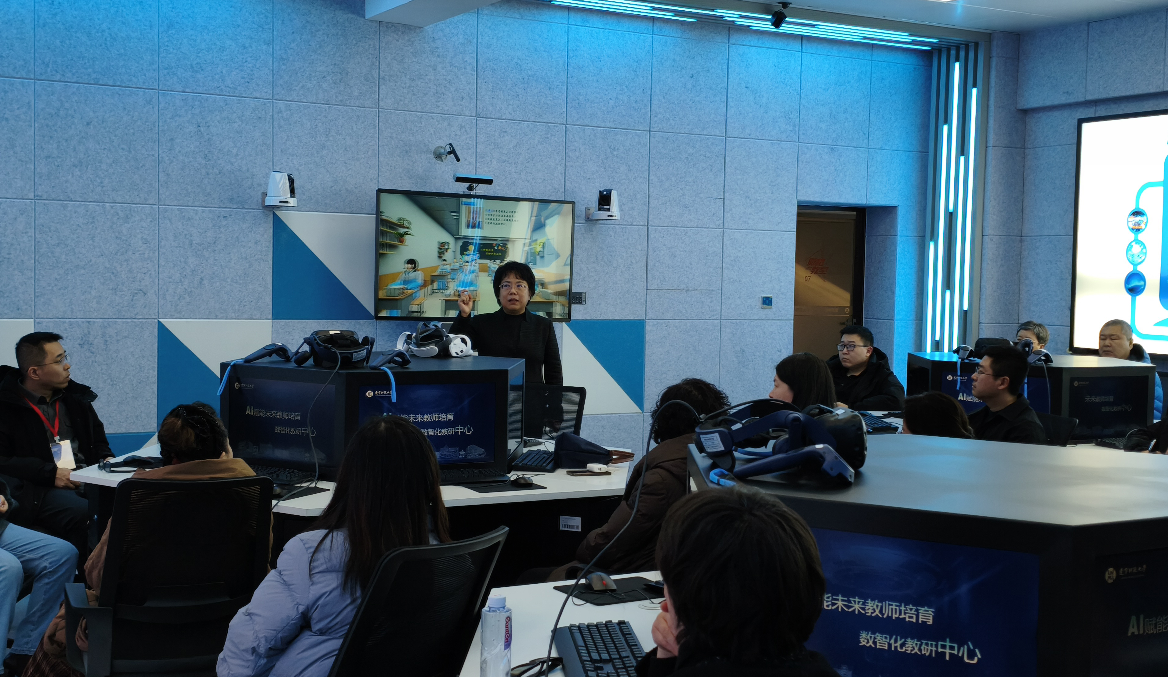 参观过程中,各学院参会人员近距离体验了VR课堂模拟、智能教学评价等特色功能,对中心将前沿技术与教师教育深度融合的创新实践给予高度评价。大家围绕跨学科资源共享、课程协同开发、人才联合培养等议题展开了深入研讨,纷纷表示将以此次参观为契机,加强与教育学部的合作联动,推动数字技术在本学科教学中的创新应用,共同构建高质量育人体系。