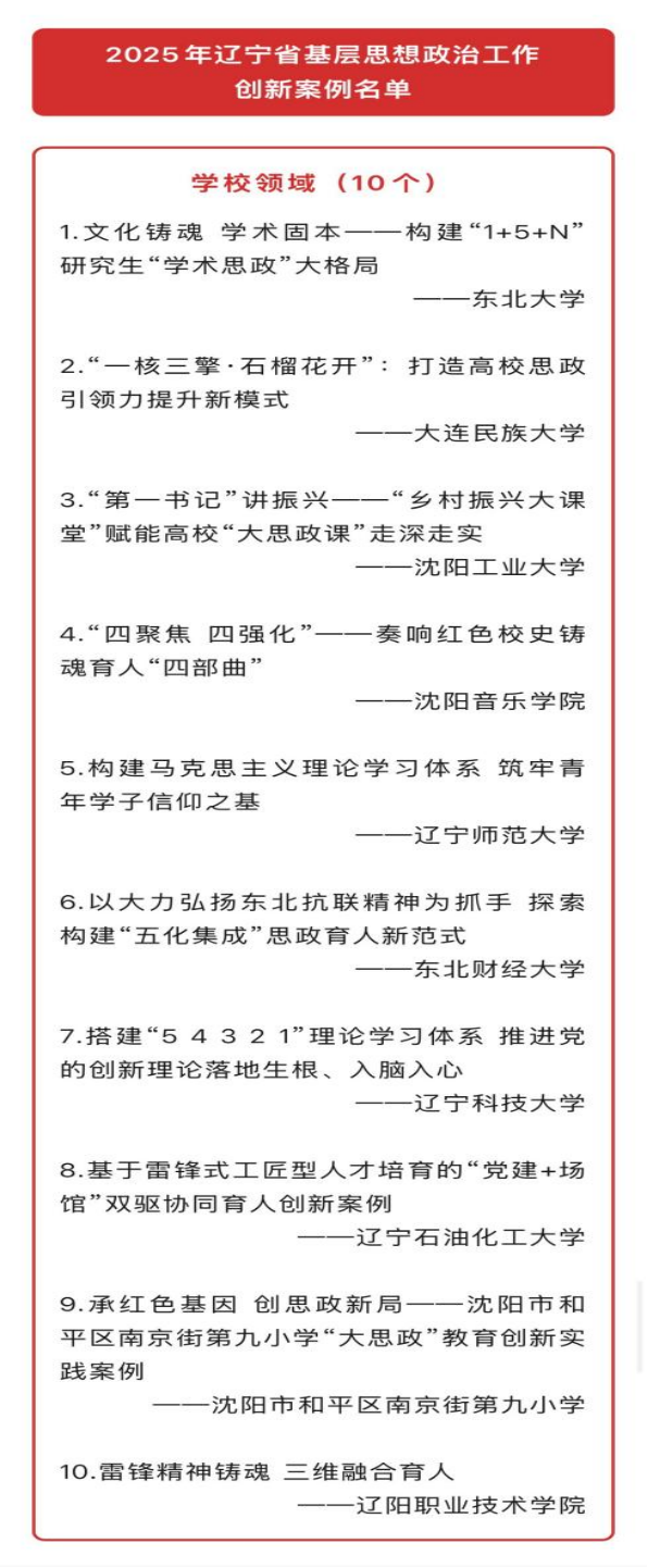 近日,辽宁省思想政治工作研究会公布2025年基层思想政治工作创新案例评选结果,我校马克思主义学院报送的“构建马克思主义理论学习体系 筑牢青年学子信仰之基”案例成功入选。此次评选经过各地各单位遴选推荐、省政研会审核、专家评审等多轮严格程序,最终确定50个优秀案例,涵盖企业、农村、机关、学校等多领域的优秀案例。这一成果的取得,既彰显了马克思主义学院在本科生思政教育领域的扎实成效与创新实力,更凸显了学校坚持立德树人根本任务、深耕思政教育创新的责任担当。