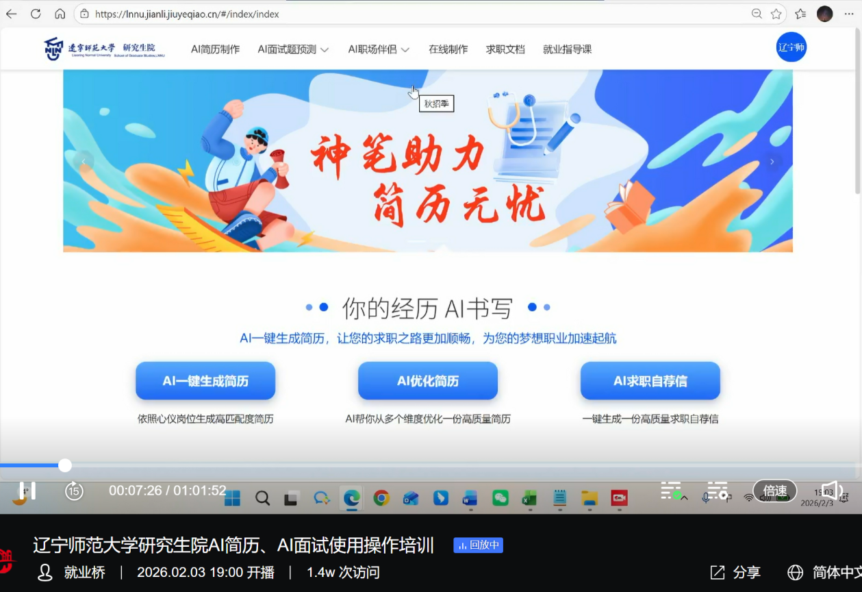 为深入贯彻教育部“寒假暖心促就业”专项行动精神,落实学校在“研究生就业服务数智化建设进展专题调研会”上的工作要求,提升研究生数智化求职应聘实战能力,促进毕业生高质量充分就业,2月3日,研究生院举办AI赋能就业平台使用操作培训会。本次培训通过就业桥平台进行直播,吸引了3578名师生参与,累计观看次数达5805次,取得了显著成效。