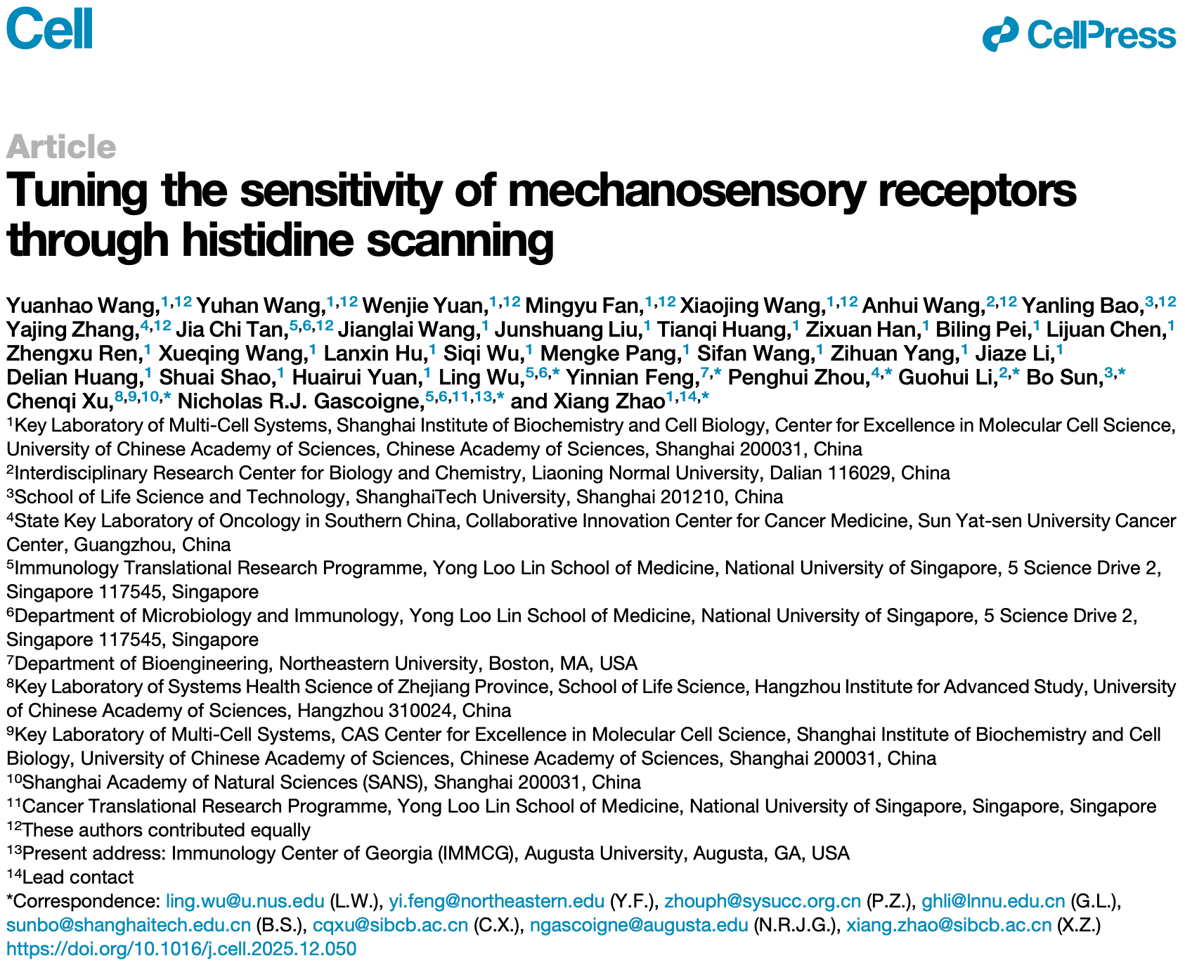 相关研究成果以“Tuning the sensitivity of mechanosensory receptors through histidine scanning”为题,发表在国际顶级学术期刊《细胞》(Cell)上。该工作由我校作为共同第一作者和共同通讯作者单位(排名第二)完成,是我校以共同通讯单位在Cell期刊发表的首篇研究论文,标志着学校在化学与生物学前沿交叉领域取得了突破性进展。