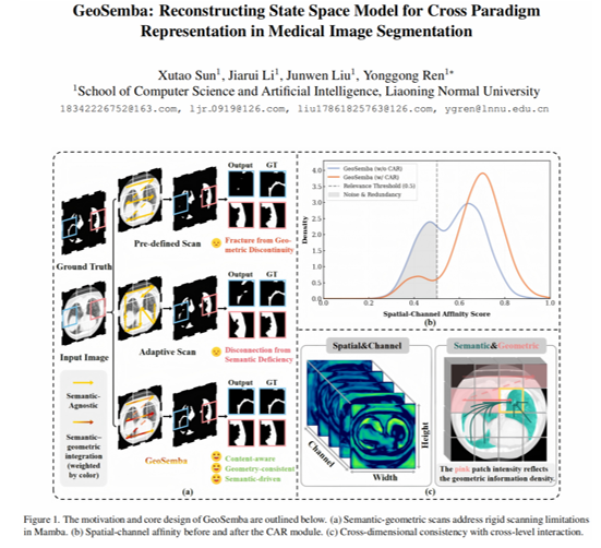 该研究聚焦视觉状态空间模型(Mamba)在医学图像分割中的关键挑战,主要包括语义信息与几何结构之间的表征错配,以及诊断线索在空间维度与通道维度交织时带来的建模困难。针对上述问题,论文提出GeoSemba框架,从状态空间方程的角度出发,对特征信息流进行系统性重构。框架中,语义引导的状态细化器(SSR)在原始特征上构建语义原型,并通过自适应方式重参数化状态更新所需的关键分量,同时显式融合空间几何关系,使模型能够兼顾组织纹理语义与结构边界轮廓,从而提升对细长结构、模糊边界与小目标的刻画能力。与此同时,跨维亲和细化器(CAR)采用“宏观感知、微观聚焦”策略,对空间与通道的依赖关系进行分层建模,并在状态更新前注入贡献感知的Top-K亲和聚合机制,强调关键区域与关键通道的响应,有效抑制噪声干扰并避免冗余关联带来的信息淹没。研究团队在覆盖六类医学模态的数据集上对方法进行了全面验证,结果表明GeoSemba在精度指标上取得稳定提升,同时在参数量与推理速度等效率指标上保持良好表现,从而为复杂医学影像场景中细粒度结构与病灶的鲁棒分割提供了一条兼顾性能与效率的可行路径。