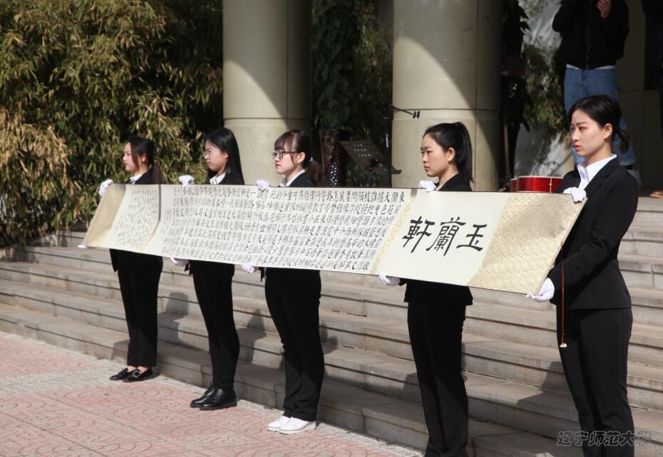 开幕式还现场演绎了由图书馆联合我校音乐学院毕业生联合创作的原创歌曲《玉兰轩》,节目伴随着“玉兰轩”歌词巨幅长卷书法作品精彩展现,该作品由中国书法家协会会员、大连市著名书法艺术家、我校图书馆馆员丁洋洋书写而成。